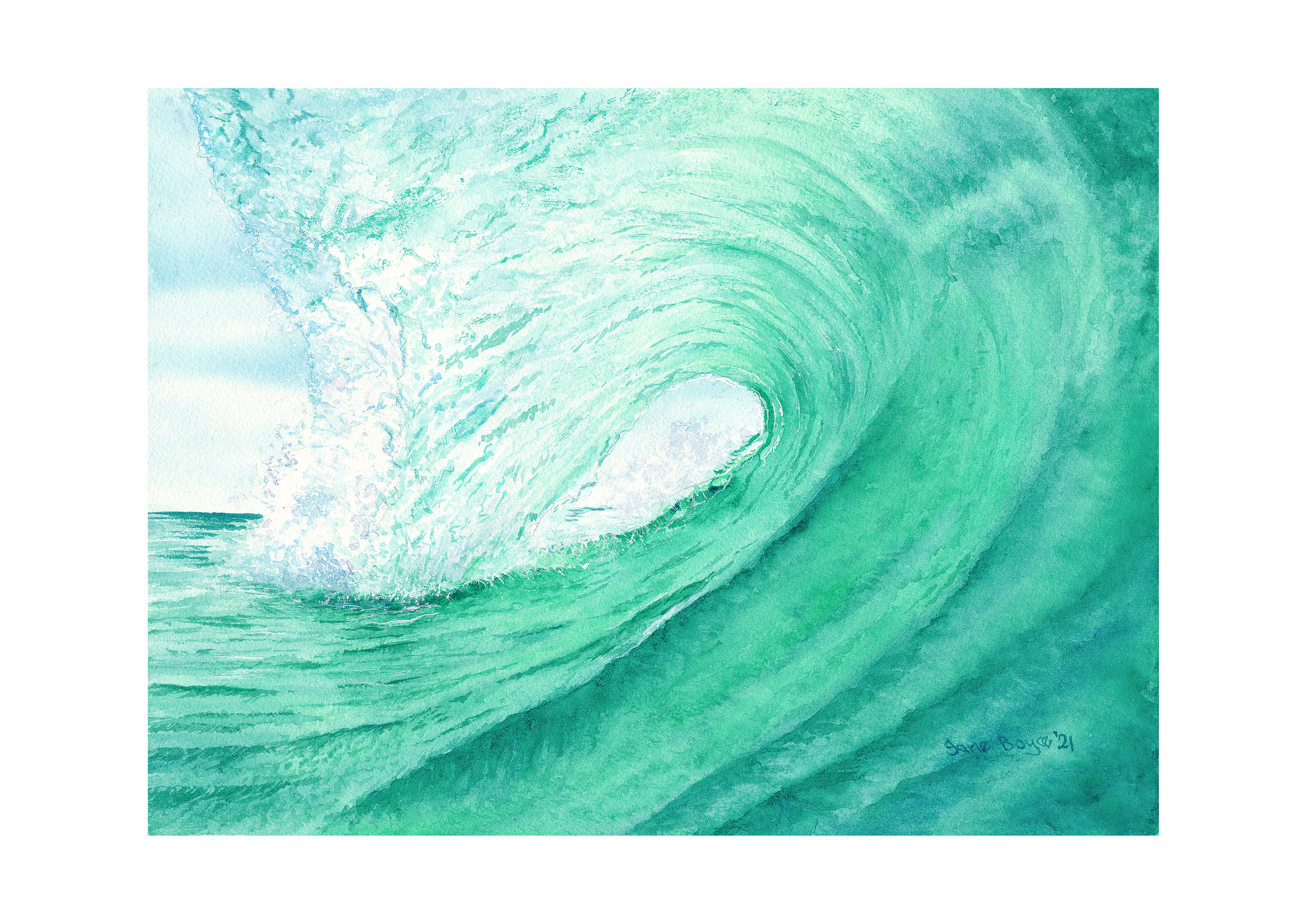 Watercolour Giclée fine art print depicting a surf wave and crystal clear water against the sky backdrop, size A4 (210 x 297) on museum quality 300 gsm paper